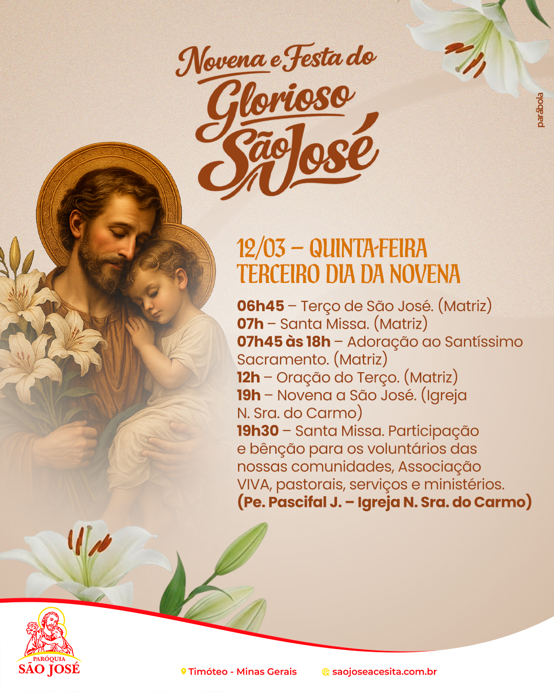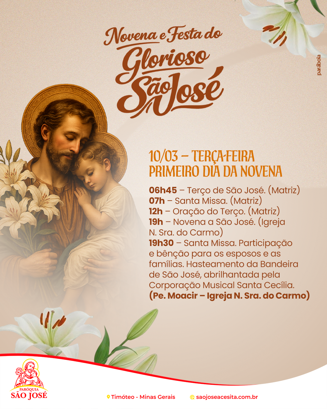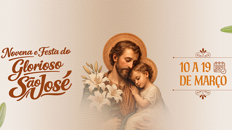 Confira a programação da Novena e Festa do Glorioso São José e participe conosco deste tempo especial de oração e devoção. Unidos como comunidade, queremos celebrar aquele que foi fiel guardião da Sagrada Família, pedindo sua intercessão por nossas famílias e por toda a Igreja.