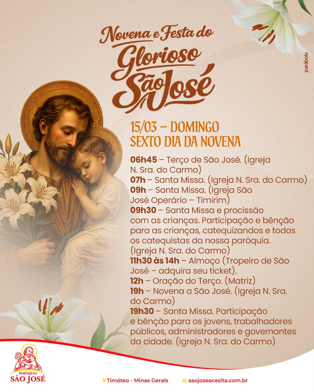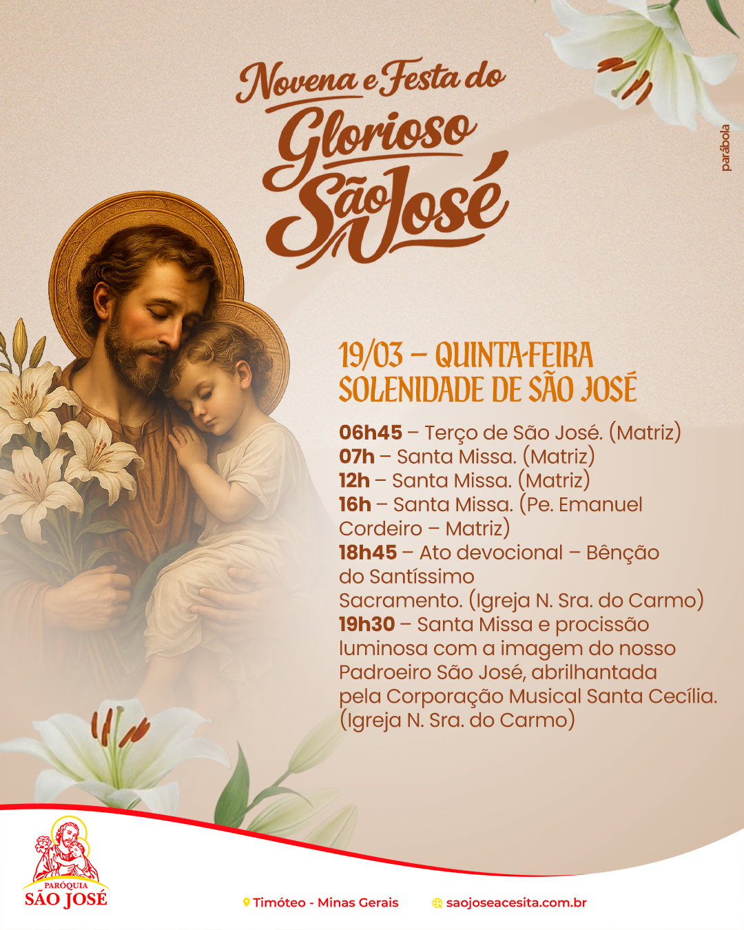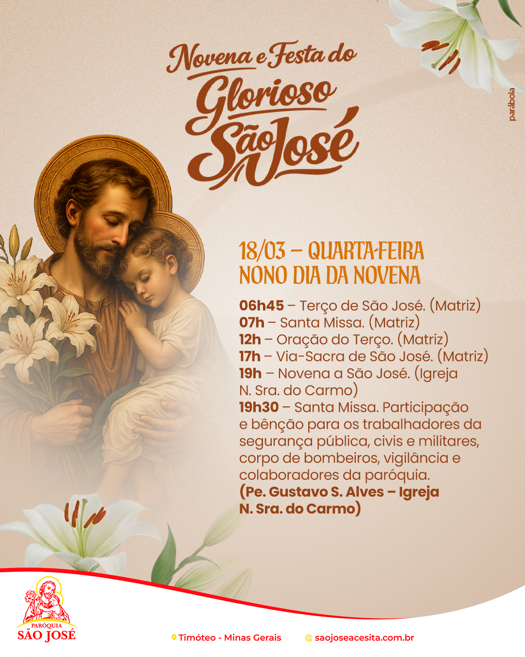 Confira a programação da Novena e Festa do Glorioso São José e participe conosco deste tempo especial de oração e devoção. Unidos como comunidade, queremos celebrar aquele que foi fiel guardião da Sagrada Família, pedindo sua intercessão por nossas famílias e por toda a Igreja.