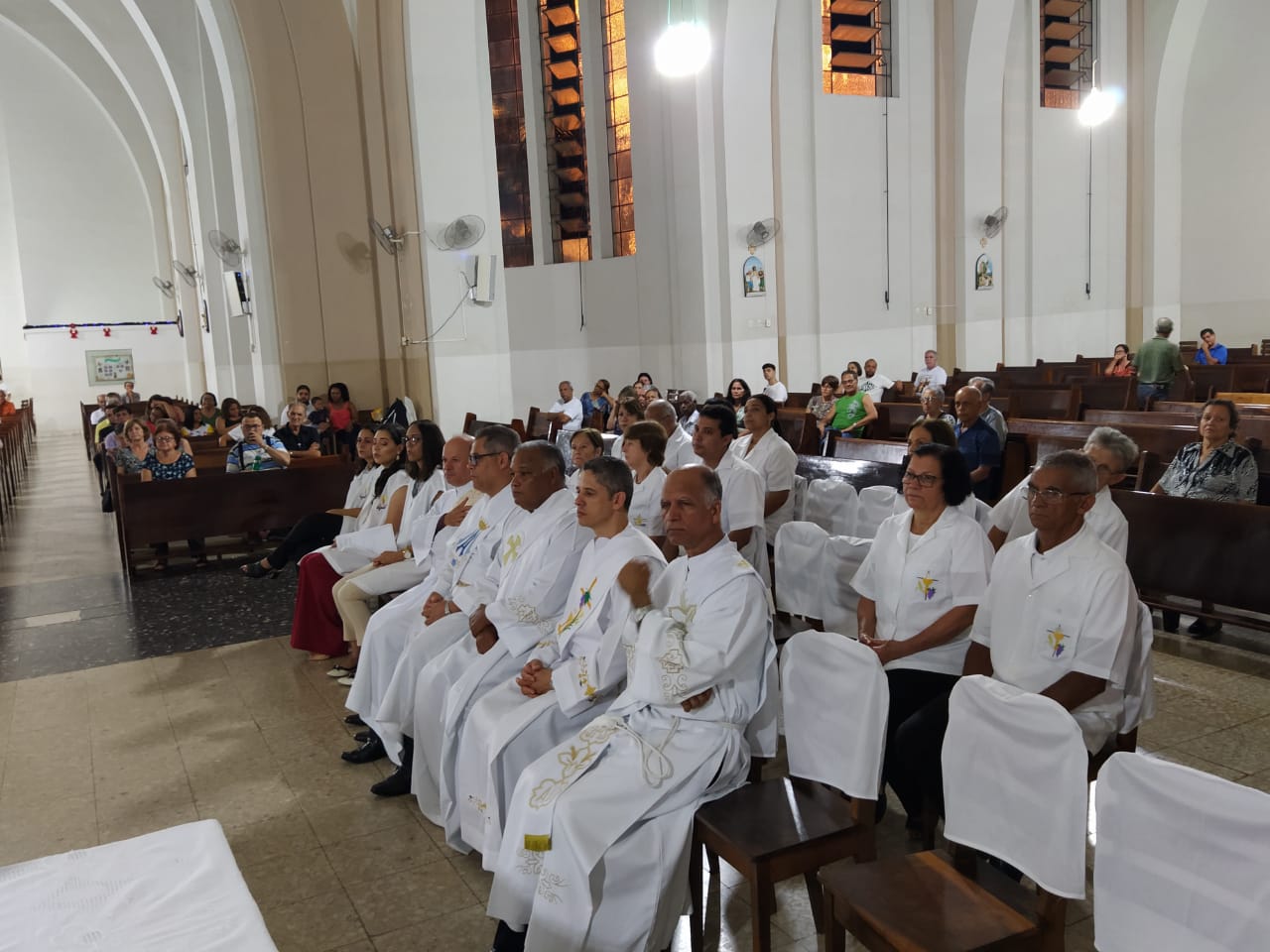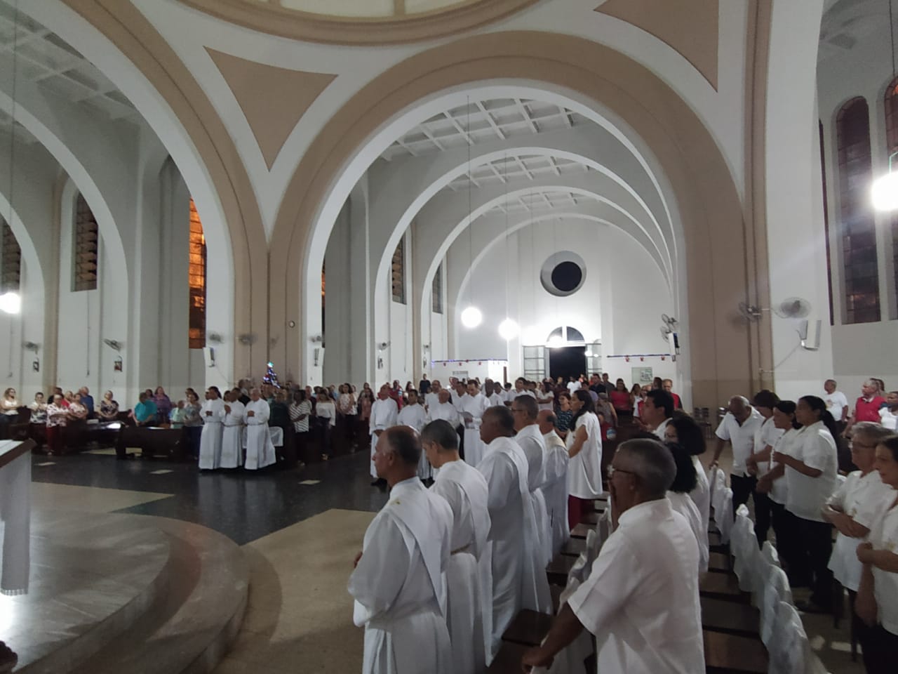Rodeados de amigos e familiares, os candidatos ao Diaconado Permanente, Adilson Edson de Miranda, Eduardo Gomes Roberto, Giuseppe Leone, Henrique Armstrong Carvalho Rodrigues, Márcio Rogério Vieira Honorato, Sérgio Odilon Benevides e Welington César de Oliveira, receberam na última quinta-feira, 5 de dezembro, na Igreja São José do bairro Timirim em Timóteo (MG), o Ministério de Acólito.